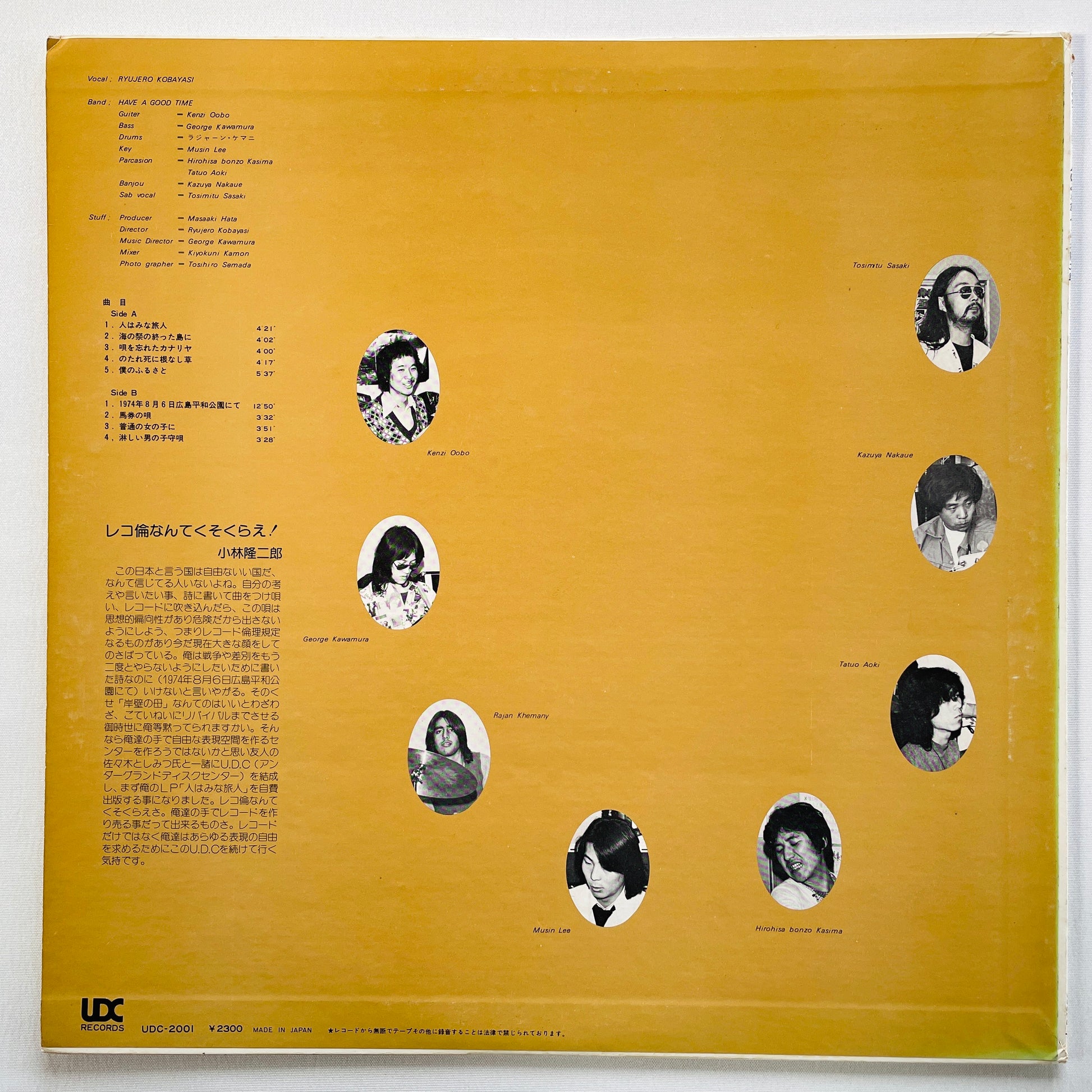 | Description | Japanese Original Pressing / Includes the intense 12-minute protest folk-rock track B1 “At Hiroshima Peace Memorial Park, August 6, 1974.” / With Kenzi Oobo, George Kawamura, Musin Lee, Hirohisa Bonzo Kashima, Tatsuo Aoki, Kazuya Nakaue, Toshimitsu Sasaki |