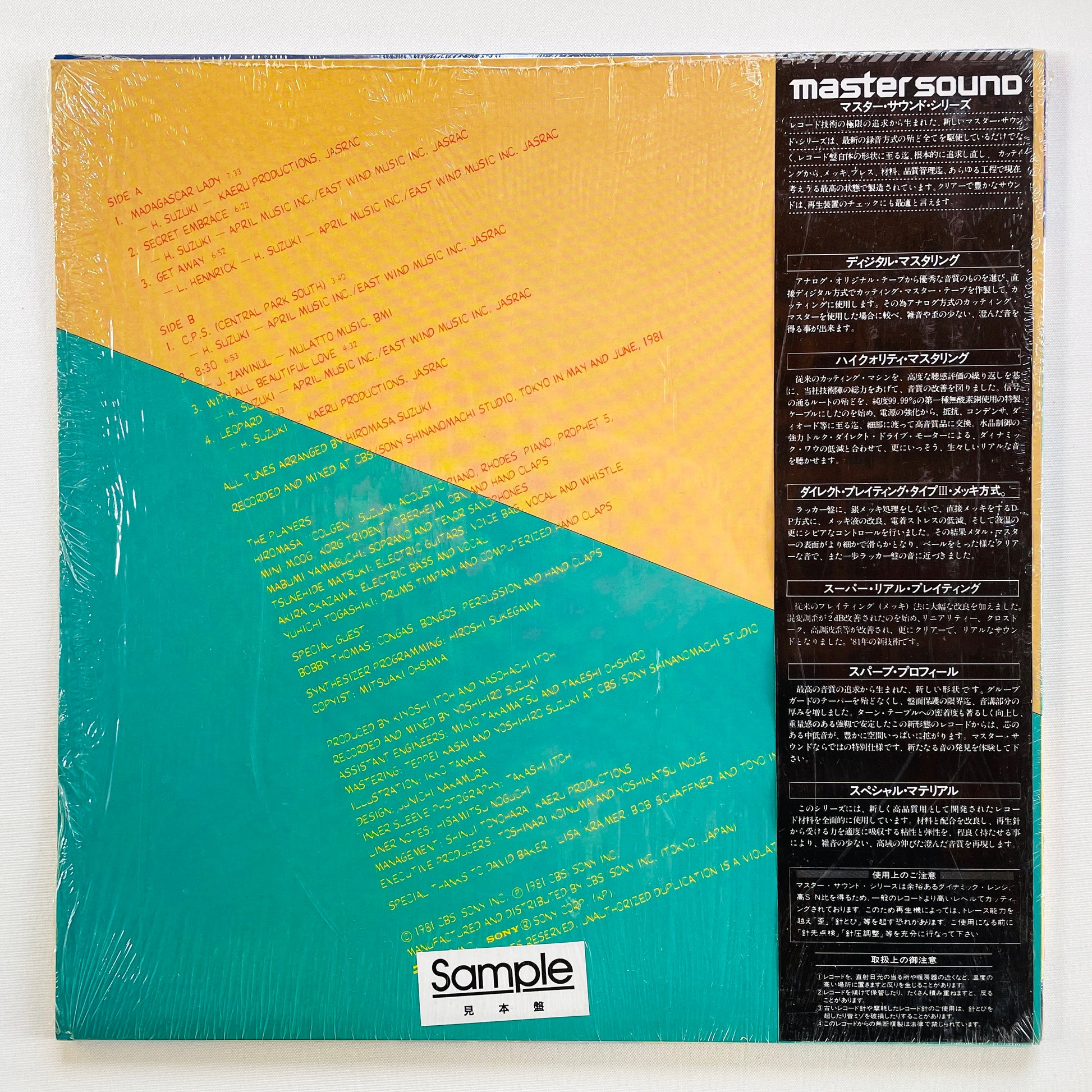 | Description | '81 Japanese Original Pressing / Audiophile Master Sound / Clean Copy! / Includes Groovy Afro Fusion A1"Madagascar Lady", Smooth Mellow Fusion A2"Secret Embrace" / The Players are Hiromasa Suzuki, Masafumi Yamaguchi, Tsunehide Matsuki, Akira Okazwa, Yuichi Tokashiki / Featuring Bobby Thomas |