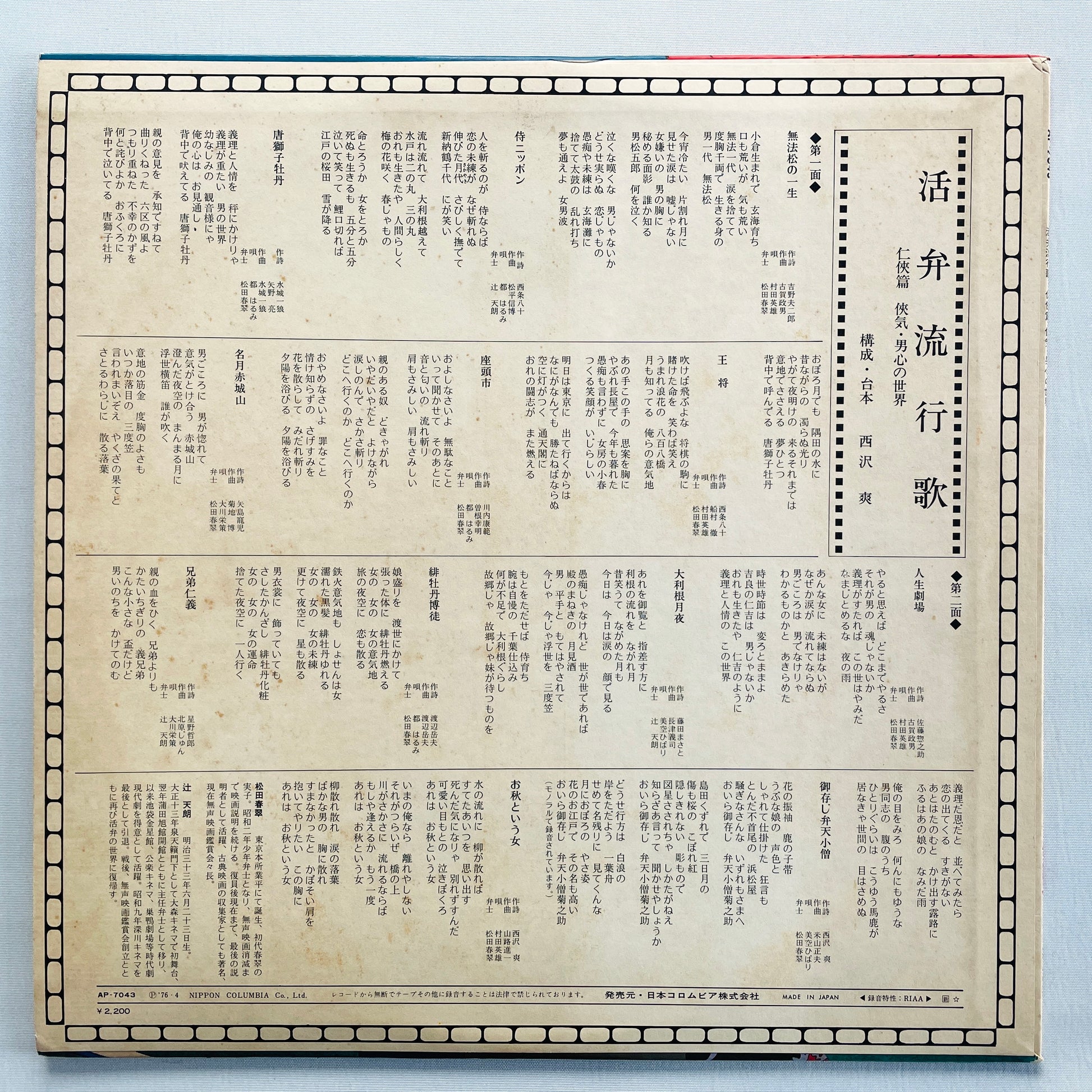 | Description | '76 Japanese Original Pressing / Clean Copy! / A yakuza narrative record that unfolds through spoken narration and song. |